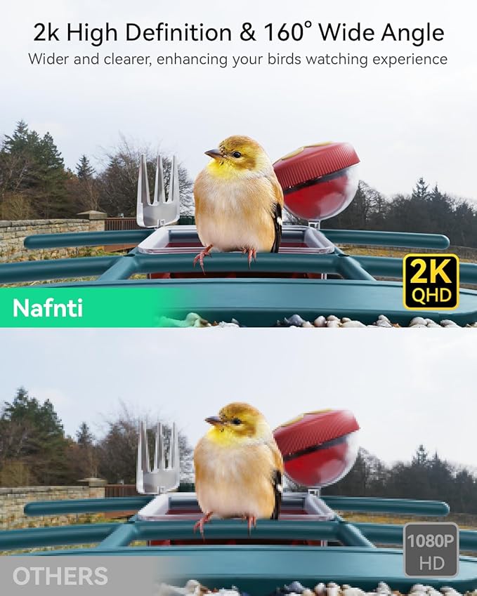 - 【Bring Nature to You with 2K HD Clarity】: Transform your backyard into a birdwatcher's paradise with the Nafnti 2K Smart Bird Feeder with Camera. Equipped with a 2K high-resolution camera and a 160° ultra-wide lens, you’ll enjoy crystal-clear, close-up views of every feather and flutter. The two-way audio feature lets you listen to the soothing sounds of birdsong. This camera is designed to focus on capturing birds at the feeder, not the surrounding area, ensuring respect for your privacy.