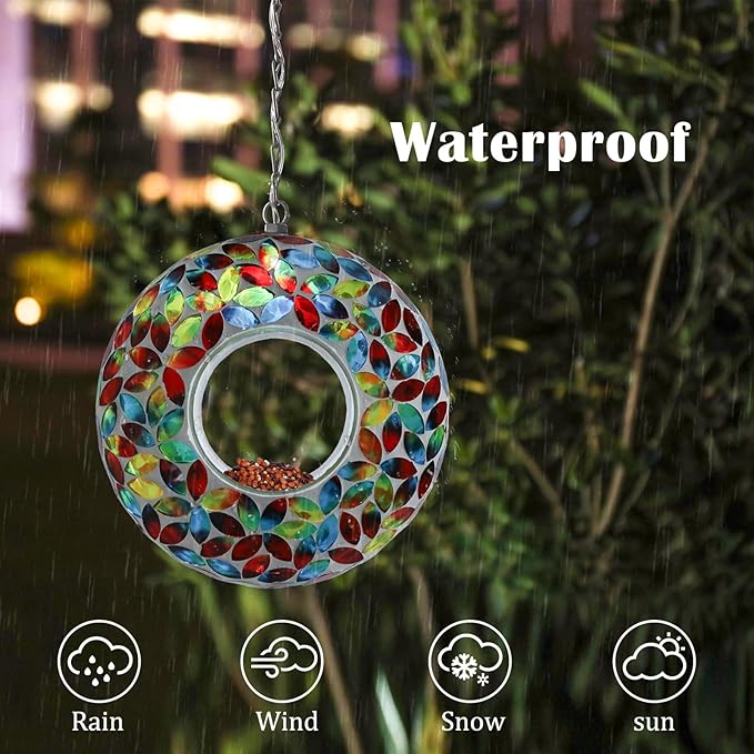 - Stunning Mosaic Artistry: Handcrafted glass mosaic bird feeder create a dazzling 8" orb. Includes sturdy hanging chain to display this functional art piece where sunlight dances across its surface - ideal for gardens, balconies, or porch overhangs