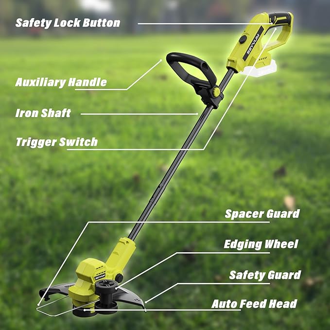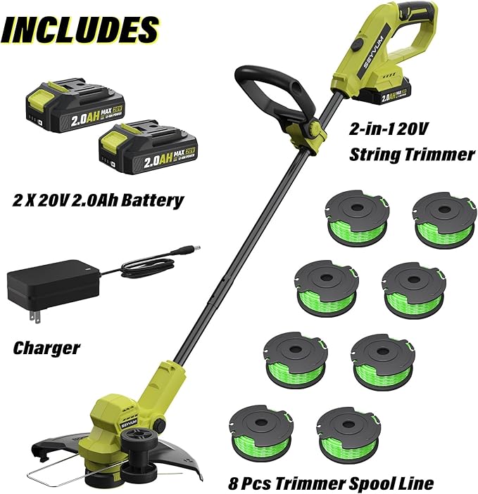 SEYVUM String Trimmer, 20V 12-inch Cordless Weed Wacker with Auto Line Feed, 2 X 2.0Ah Battery Powered Lawn Edger with 8 Pcs Grass Cutter Spool Line, Fast Charger Included, Lemon Green