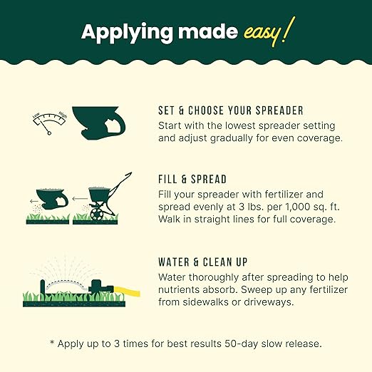 - EASY ALL-SEASON APPLICATION: Apply our grass fertilizer for lawns, in early spring when temperatures reach 50-89Β°F. Perfect for any lawn or grass type: simply spread evenly with a broadcast or drop spreader.