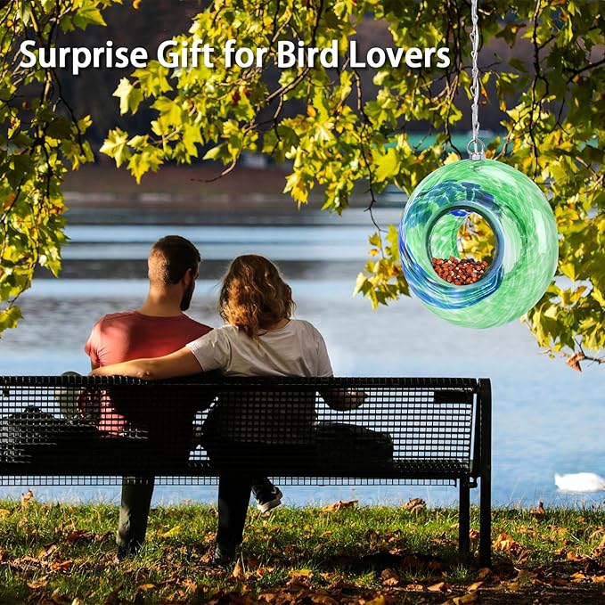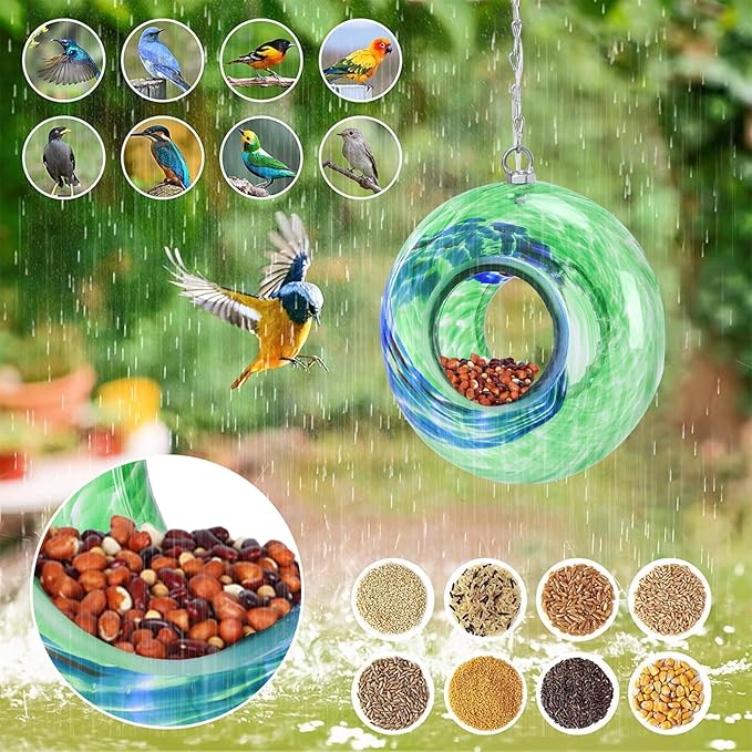 Yinns Glass Bird Feeders, Hanging Fly Through Birds Feeder for Outsiade, Solar Birdfeeder for Garden Decor Bird Lvoers Gifts, 8-Inch(Green)