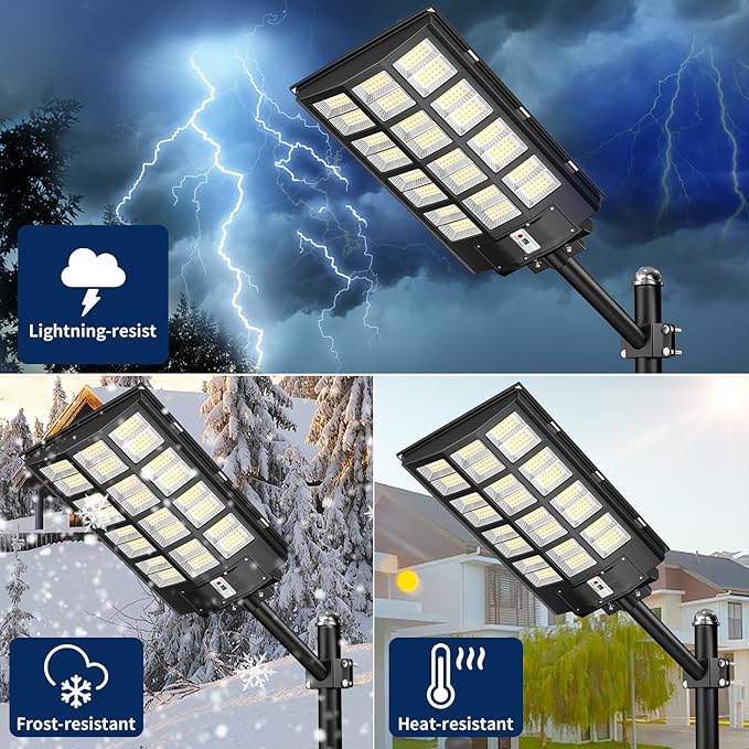 - 【High Lumen Solar Street Lights】This bright solar street lights outdoor Waterproof uses high efficiency 324 pcs brightest LED beads. LED beads with large chips and high lumen,it is bright than other LED beads. Street lights solar powered with 6500k color temperature,it is no yellow and provided clear and bright vision,produce up to high brightness output and good heat dissipation.