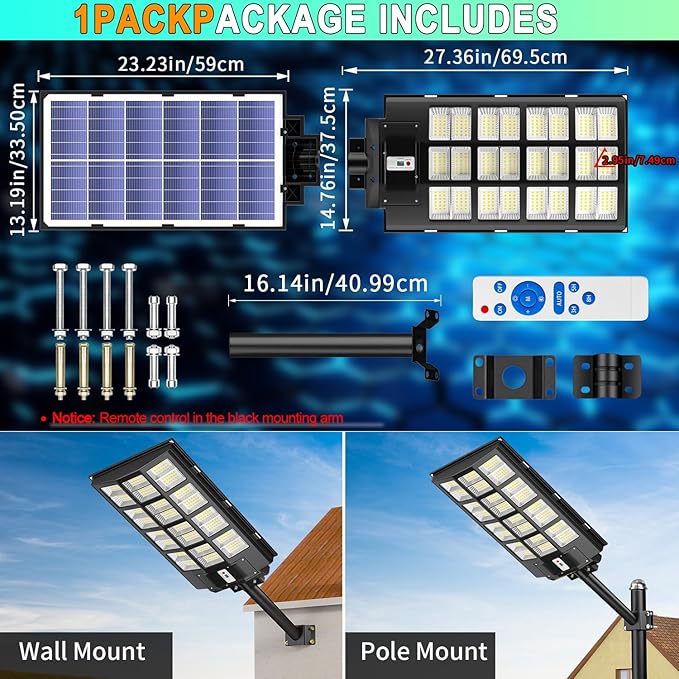 - 【0 Electricity Bill and Long Battery Life】This solar powered street ights is charged at the daytime for 6-8 hours,and the working time more than 24 hours. Powered by solar and no need to pay extra electricity bill. Solar lights outdoor built-in 33000mAh battery, monocrystalline silicon solar panels makes conversion rate up to 25%. the lifespan up to 7 year.