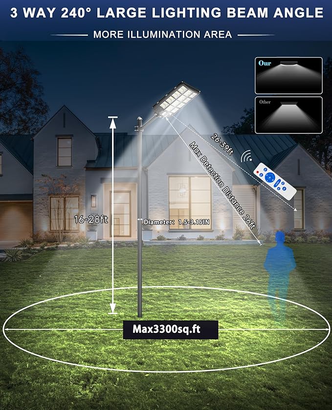 - 【240 degree large wide-angle lighting and Large illuminates area】Upgrade 3-way 240 degrees wide-angle lighting, it provides a wider range of lighting and brighter light compared with ordinary 180° solar flood lights outdoor. The Illumination area is up to max 3300sq.ft , which covers more area. We suggest you install our parking lot lights commercial 10-22ft above the ground.Support street light pole diameter 1.5"-3.75".