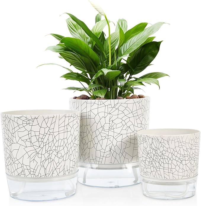 Self Watering Pots for Indoor Plants, 6 & 5 & 4 Inch Stylish Flower Pots, Set of 3 Modern Planters with Self-Watering Feature (Crack Texture)