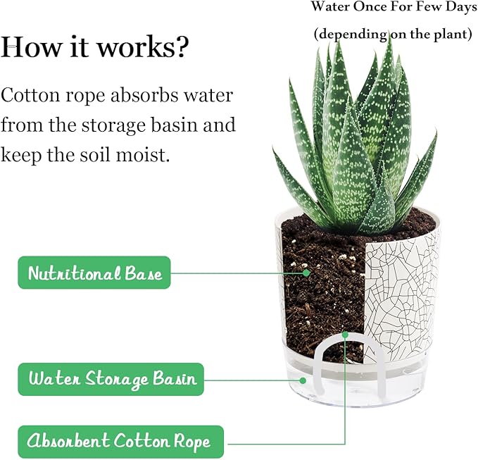 - Self-watering: The plant pots can store water for period after a single watering (depending on the plant) and provide nutrients to your plants. They make it easier to grow plants, typically utilizing a white cotton rope to absorb water and ensure that the plants receive the necessary moisture.