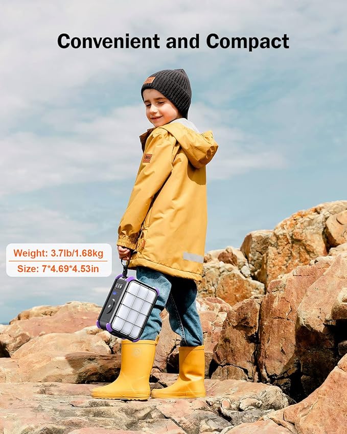 - Compact and Intelligent Design: Miniature size (7 x 4.69 x 4.56 inches) with a 153.92Wh capacity, this mini generator is lightweight (3.7 lbs) and built with a sturdy casing for easy portability. Equipped with eight shock-resistant silicone pads for added protection, it’s designed for outdoor adventures. The portable power bank includes a leather loop for effortless carrying. The user-friendly interface features intuitive buttons and a digital display, allowing you to easily monitor battery status and adjust settings. A reliable electric generator that combines portability with powerful performance.