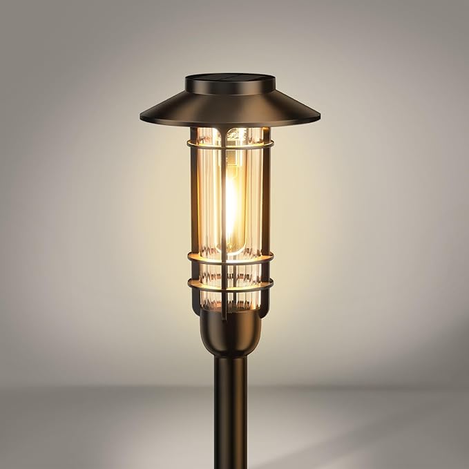 - Unique Pathway Light in 2025: Elevate your outdoor space with these solar pathway lights. Featuring a scalloped top design and striped transparent shade with LED tungsten filament bulbs. 2700K warm white solar lights outdoor not only add a delightful touch of elegance but also emit an evenly bright and soft lighting, providing lighting and decoration for various outdoor spaces, such as gardens, lawns, and pathways. Our timeless solar outdoor lights add storybook charm to porches, walkways, and backyard landscapes, creating enchanting evenings under the stars.