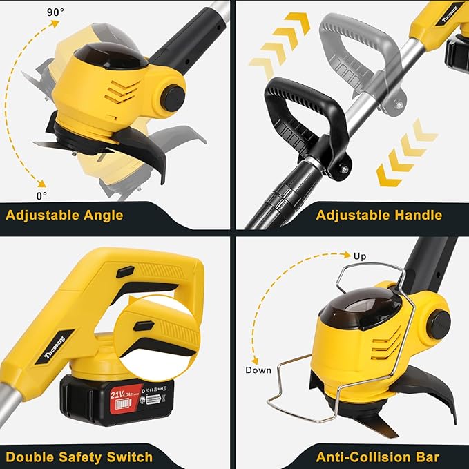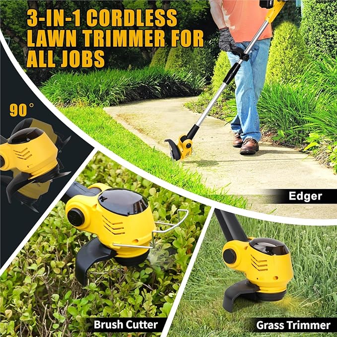 - Lightweight and comfortable: Lawn edger cordless is of moderate height and weighs only 7.4lb, which is easy for even the elderly and women to control. The auxiliary handle adopts high-quality soft grip to provide a more comfortable control experience. The angle of the weeder head can be adjusted from 0-90°, and you can trim the back of the bushes without bending over. The battery brush cutter adopts a detachable lever to help you save warehouse space.