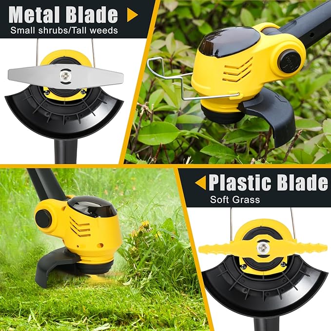 - Upgraded blades: The blades of the weedeater are made of higher-quality materials to meet various gardening needs①The metal diamond blade is suitable for trimming plants and old weeds, as well as thick shrub branches. ② Plastic blades are suitable for trimming soft lawns and light weeds. (1 upgraded nylon plastic blade is equivalent to 5 ordinary blades on the market) Upgraded nylon plastic blades are suitable for trimming soft lawns and thick weeds