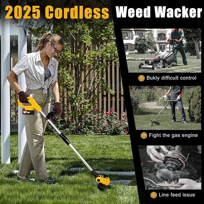 - New upgrade and quality service: Use this cordless weed wacker electric to experience a quieter and safer weeding experience. In addition, the mower comes with a two-year warranty. If you have any problems during use (battery, product problems), please feel free to contact us by email, we will give you a satisfactory reply within 24 hours!