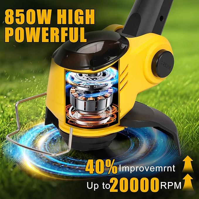 - Powerful motor: This electric weed wacker cordless is equipped with a high-performance motor with a maximum speed of 20000rpm, and is equipped with battery overheat protection technology to greatly increase the product life. The cordless grass trimmer is equipped with 2 large-capacity batteries to help you get rid of the constraints of wires, saving resources and money, while being quieter, safer and more portable than gas or wired trimmers.