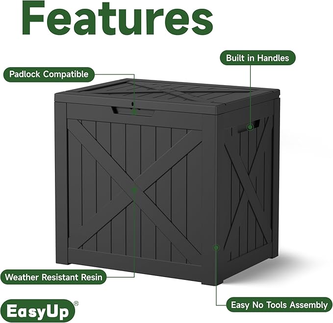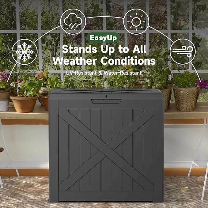 - ENHANCED SAFETY FEATURES - The EasyUp storage box features a hydraulic rod that allows for smooth lid opening and closing, reducing the risk of accidental pinching. The built-in locking mechanism adds an extra layer of security, making it ideal for safeguarding outdoor valuables.
