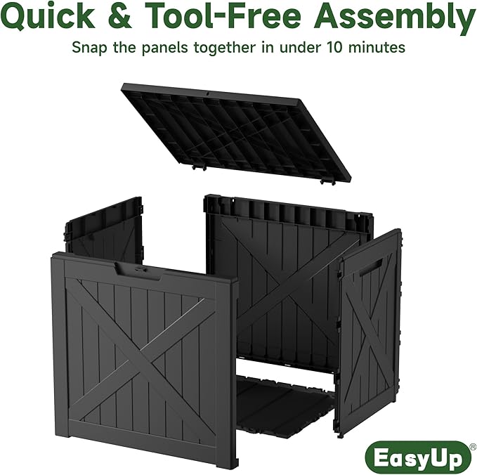 - EASY ASSEMBLY & CONVENIENT HANDLING - Assembling the EasyUp deck box takes just 20 minutes with no tools required. Snap the panels together for a quick setup. Ergonomic side handles ensure easy transportation, so you can move it effortlessly wherever itβs needed.