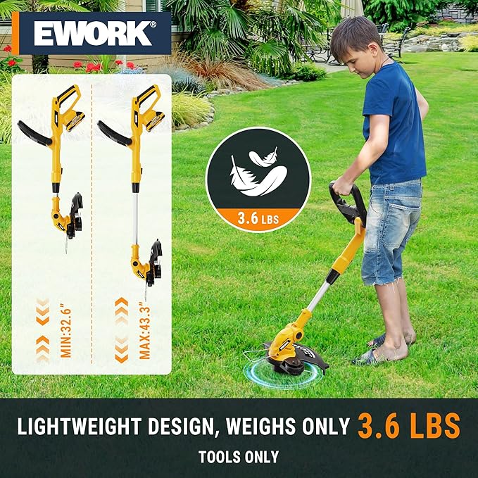 - ✅[ 12-MONTH WARRANTY AND SUPPORT ] EWORK lawn trimmer cordless comes with a 12-month warranty and 24/7 customer service. During this period, we will help you solve any problems related to the product, installation or use