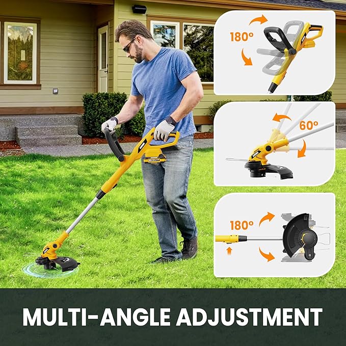 - ✅[ 2-IN-1 STRING TRIMMER & EDGER ] EWORK cordless weed trimmer adopts a new ergonomic design, which is fully considered for all kinds of people, . It is equipped with 180° adjustable body, 180° adjustable auxiliary handle and 60° adjustable cutting head, effortlessly converts between trimming and edging modes. You can easily complete the mowing according to the space and comfortable angle needs