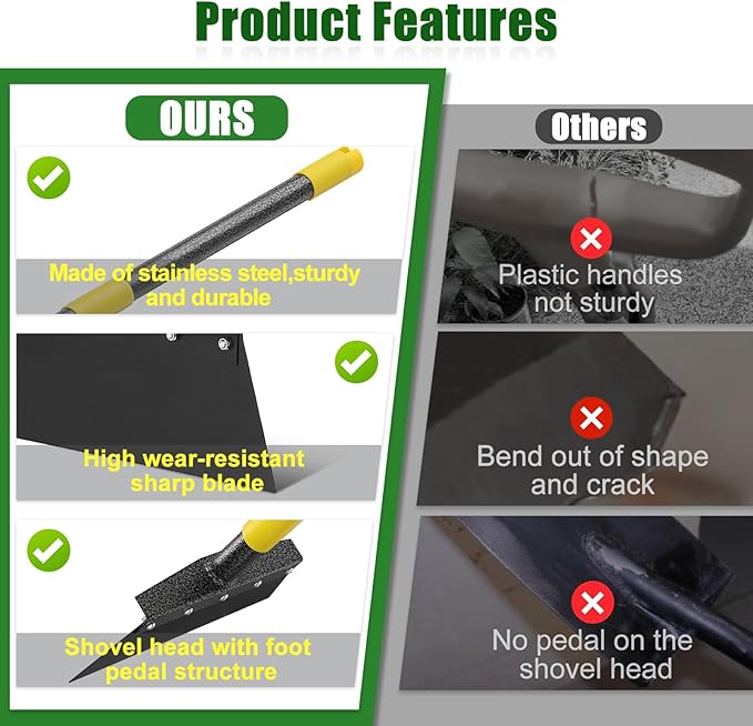 - Extra-Large Blade for Enhanced Productivity - Featuring a generous 4.3" x 10.6" blade, our shovel is engineered to boost your productivity. The blade is not only super sharp but also thickened to prevent rolling, ensuring efficient and precise work every time. Its rust-proof design ensures it performs optimally in any environment.