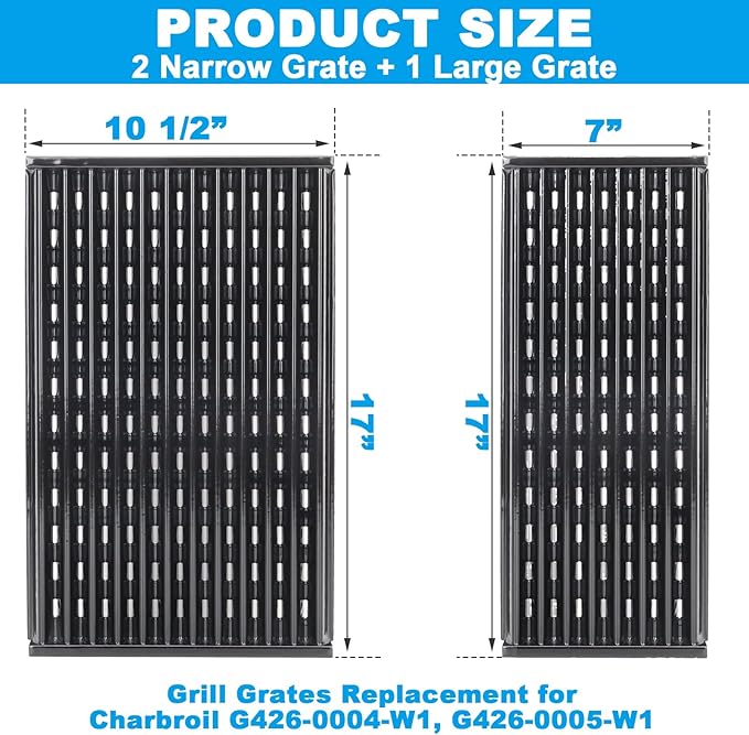 - Package Contents: Includes 2 pack 17" cooking grates (2 narrow grate,Dimension:17"x7" + 1 large grate,Dimension:17"x10.5"). Grill grates replace for Charbroil Original Model G426-0004-W1, G426-0005-W1. Please kindly check the size and model of your grill part before order