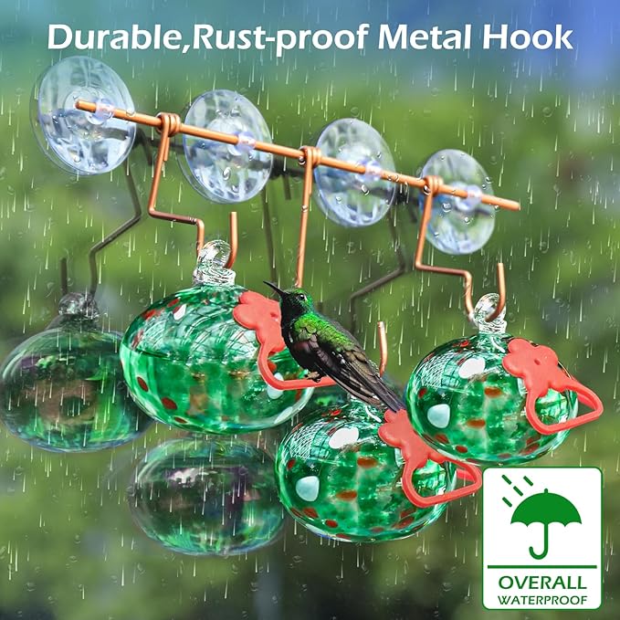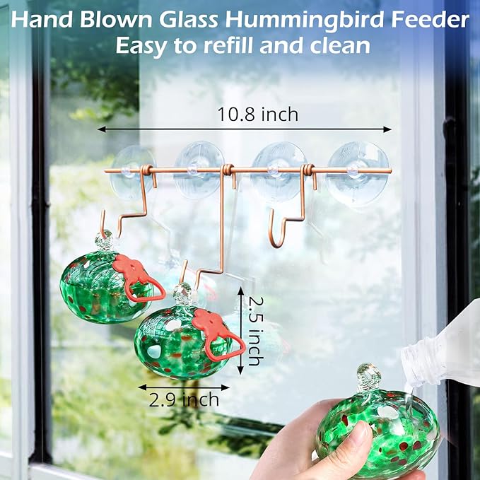 - Handcrafted Glass Art:Each small hummingbird feeder ball is expertly crafted by skilled artisans,never fade or leak,easy to clean and refill;featuring eye-catching red silicone flowers that not only attract hummingbirds quickly but also protect their tongues from injury;Decorative hummingbird feeders for outdoors,garden,yard