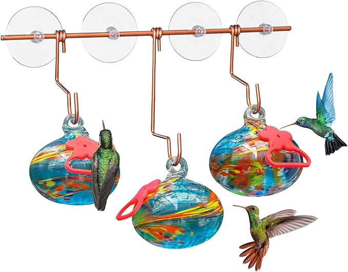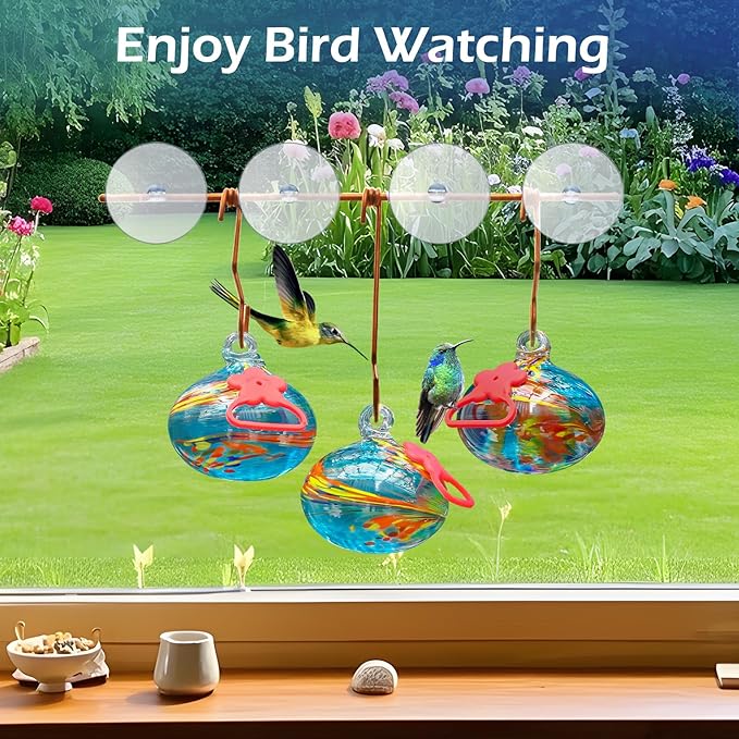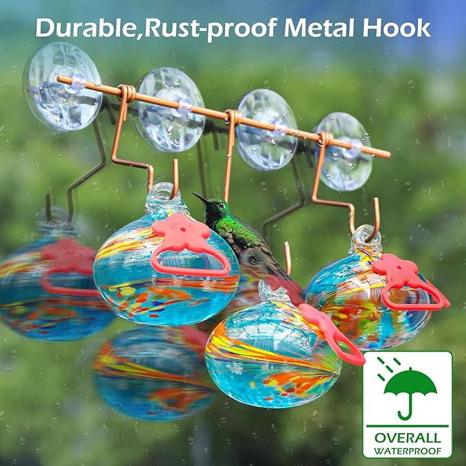 - Handcrafted Glass Art:Each small hummingbird feeder ball is expertly crafted by skilled artisans,never fade or leak,easy to clean and refill;featuring eye-catching red silicone flowers that not only attract hummingbirds quickly but also protect their tongues from injury;Decorative hummingbird feeders for outdoors,garden,yard