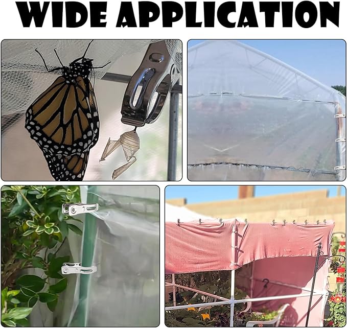 - đȘăMulti-use ApplicationăThese stainless steel garden greenhouse clamps strong enough to fasten films, garden beds, plant netting and covers on your greenhouse hoops to prevent them slipping off or being blown away by the wind. It is ideal choice for building greenhouse and helpful choice to anyone who want to use them for garden. Also you can use these clips such as food bag closure clips, clothespins, documents clips, photo clips, cord clips, binder clips, hanging up string lights clips etc.
