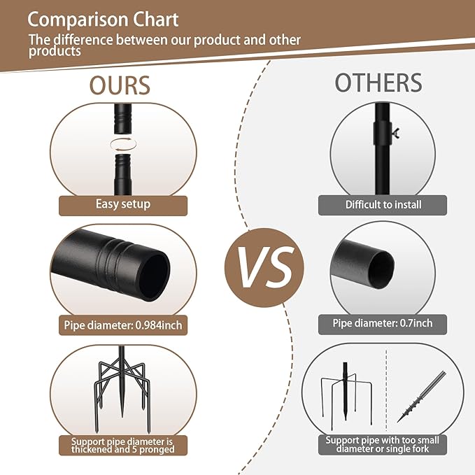 - 【Practical Design】The five-leg base is reinforced to ensure that the pole is more stable in the soil. The four legs are made of solid iron rods instead of hollow iron tubes, making it stronger and more durable than traditional birdhouse poles.