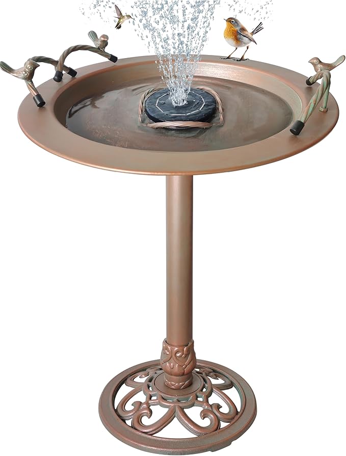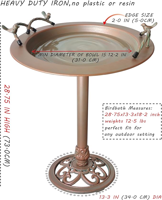 - Durable Construction: Iron material with coating resists rust and damage from the elements while the sturdy base prevents the birdbath from tipping over.