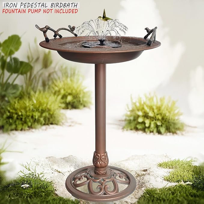 - Bring a charm to a garden and provide a refreshing oasis for your feathered friends with this beautiful pedestal iron birdbath. Don't waste time with plastic or resin bird baths…