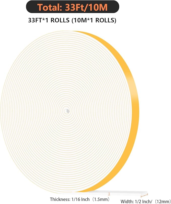 Weather Stripping Door Seal,Weather Stripping,Soundproof,Cold Insulation,High Density CR Foam Insulation Tape for Door,Windows (White, 1/2 in x 1/16 in x 33Ft)