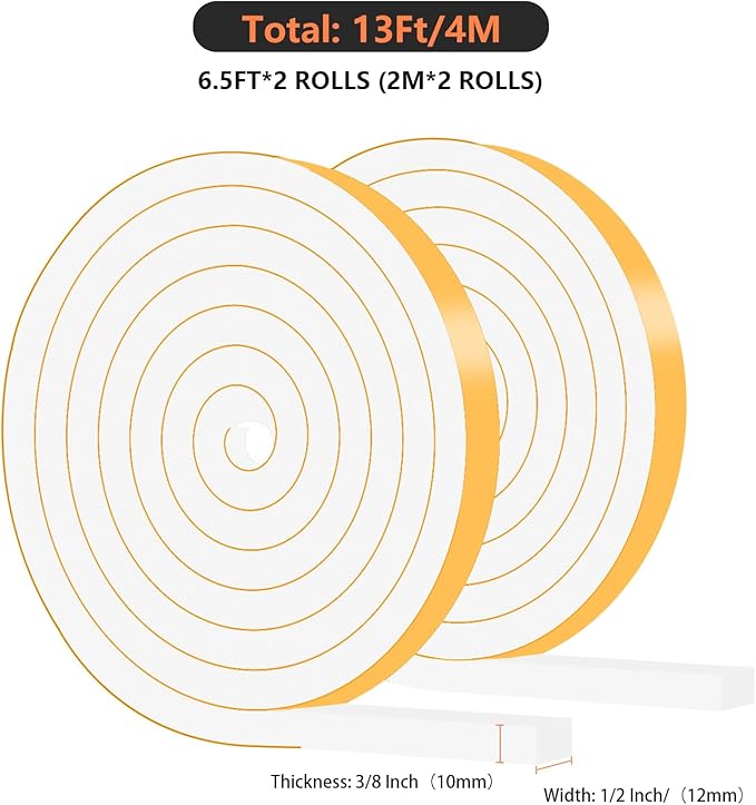 Weather Stripping Door Seal,Weather Stripping,Soundproof,Cold Insulation,High Density CR Foam Insulation Tape for Door,Windows (White, 1/2 in x 3/8 in x 13Ft)