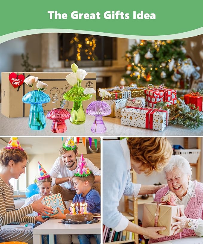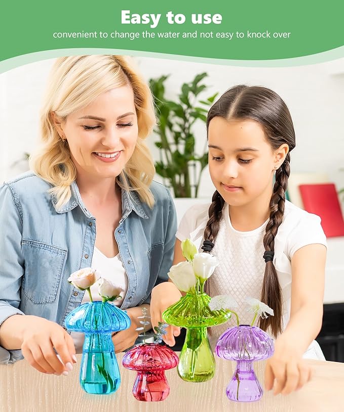 - Retro Home Office Décor: Brings bursts of colorful art into your home.Set of 4 Mushroom-shaped hydroponic vases in diverse sizes and vibrant colors are ideal for home decor, office settings, or as unique gifts for plant enthusiasts. Their compact dimensions seamlessly blend with modern interior aesthetics