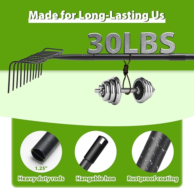 - All-Metal Construction,Built to Last Seasons: Made of high-strength steel, this rake is designed to withstand the pressure of daily yard work and heavy debris clearing. The rust-resistant coating adds an extra layer of protection for year-round performance in any weather