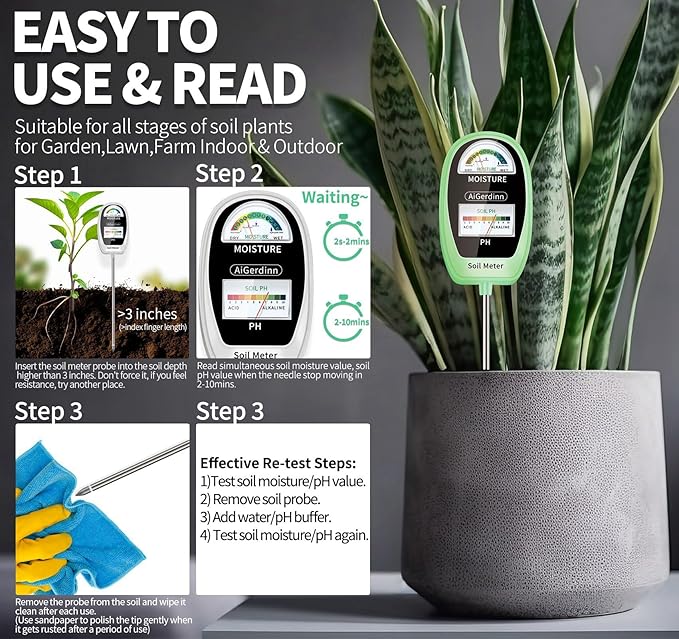 - Notes & Worry-Free Service: The 2in1 moisture meter for plants can only measure the moisture and testing pH of the SOIL, please don't test in water/any liquid. AiGerdinn provides a 365-day warranty and 24-hour friendly customer service. Please feel free to contact us if you have any issues with the 2-in-1 soil meter. We will do our best to correct the wrong, give you the best solutions, which can save your time waiting for processing progress.