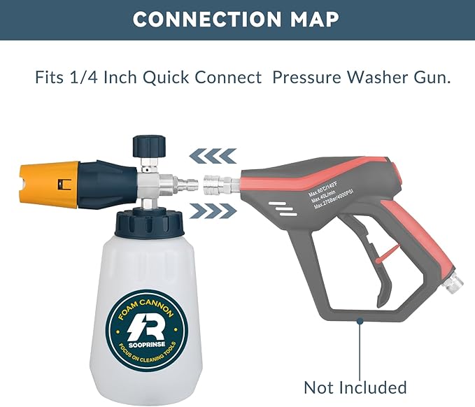 - Please Note:This product is equipped with a 1/4" Quick Connection Plug. Please check your pressure washer connector before buying as some connectors are not suitable. The foam cannon conects to the pressure washer gun/wand only, it is NOT fit any garden hose.