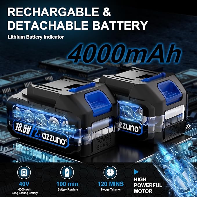 - 【Cordless Design Flexible Operation】The AZZUNO cordless hedge trimmer comes with removable 2*lithium-ion batteries (20V 2000mAh), allowing you to say goodbye to tangled cords. Fully charged in just 2 hours, each battery provides up to 45-60 minutes of runtime, letting you trim anywhere without needing a power outlet or extension cord. Perfect for reaching every corner of your garden and boosting your work efficiency