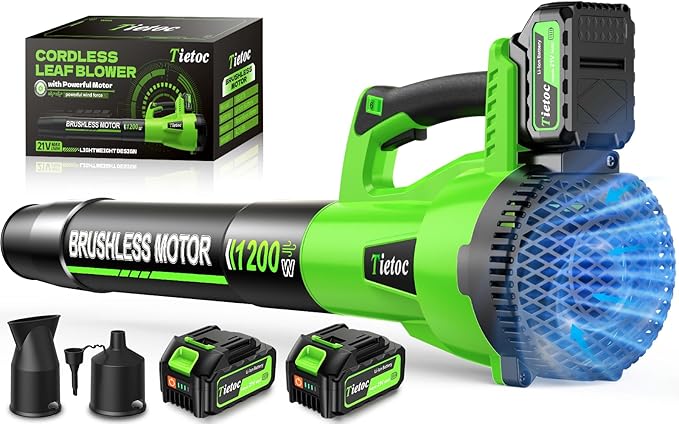 Tietoc Leaf Blower Cordless, 1200W Brushless Electric Leaf Blower with 2 X 5.0Ah Battery, 6 Speed Levels, 2 Extended Tube and 3 Nozzles, Powerful Leaf Blowers for Garden,Yard,Lawn Care (Green)