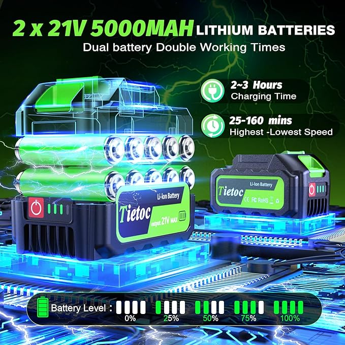 - ๐๐๐๐๐๐๐ฆ๐๐ก ๐๐๐ญ๐ญ๐๐ซ๐ฒ ๐๐จ๐ง๐ -๐ฅ๐๐ฌ๐ญ๐ข๐ง๐ ๐๐ง๐๐ฎ๐ซ๐๐ง๐๐: Tietoc battery powered leaf blower with two 21V 5.0Ah high-capacity lithium batteries and a safety charger. Users can charge one while using the other, enabling theoretical "infinite runtime"โideal for continuous tasks like yard cleaning and lawn maintenance. 2 batteries can last at most 25 minutes at highest speed and 160 minutes at lowest speed . The batteries are equipped with overheat protection, which is safe