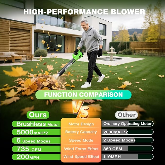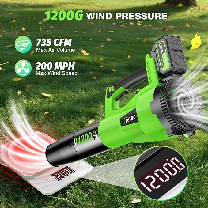 - ๐๐๐๐๐๐๐๐ ๐๐จ๐ฐ๐๐ซ๐๐ฎ๐ฅ ๐๐ซ๐ฎ๐ฌ๐ก๐ฅ๐๐ฌ๐ฌ ๐๐จ๐ญ๐จ๐ซ: Tietoc cordless leaf blower featuring an advanced brushless motor with a speed of up to 32000RPM, a maximum air volume of 735CFM, a maximum wind speed of 200MPH, it easily blows away damp fallen leaves, stubborn snow, and deep crevice dust, with a higher cleaning efficiency! In long-term high-intensity work, brushless motors can easily maintain low-temperature stable operation and have a longer working life!