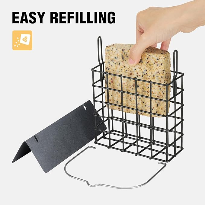 - Robust Materials: The outdoor suet bird feeder is designed for repeated use and features a rust-resistant coated metal, a waterproof roof, and a hanging wire. Our outdoor suet feeder is suitable for your feathered friends such as chickadees, sparrows, nuthatches, and woodpeckers.