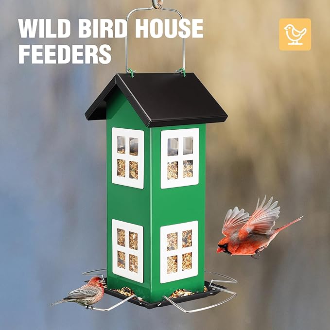 Veehoo Bird House Feeders for Outdoors Hanging-Metal Wild Bird House Feeders with 4 Ports, Country House Design, Garden Yard Decor Hanging Bird Feeder for Outside, Large Capacity, Green