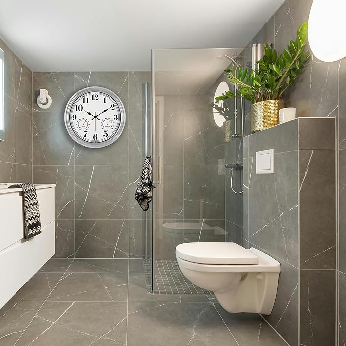 JENLYSTIME 16 Inch Silver Vintage Waterproof Indoor/Outdoor Wall Clock with Thermometer & Hygrometer, Large Numerals & Silent Sweep Movement - Ideal for Porch, Garden, Pool