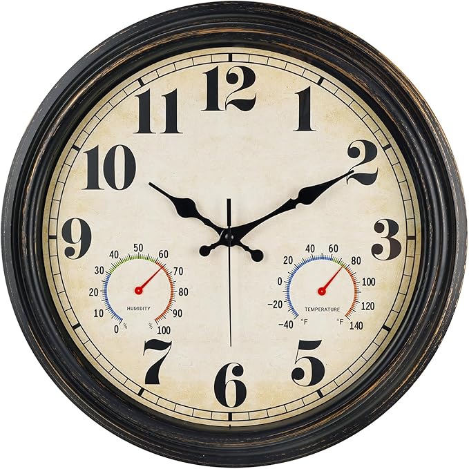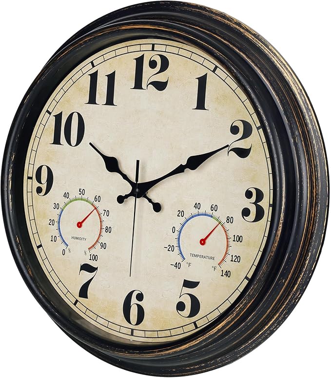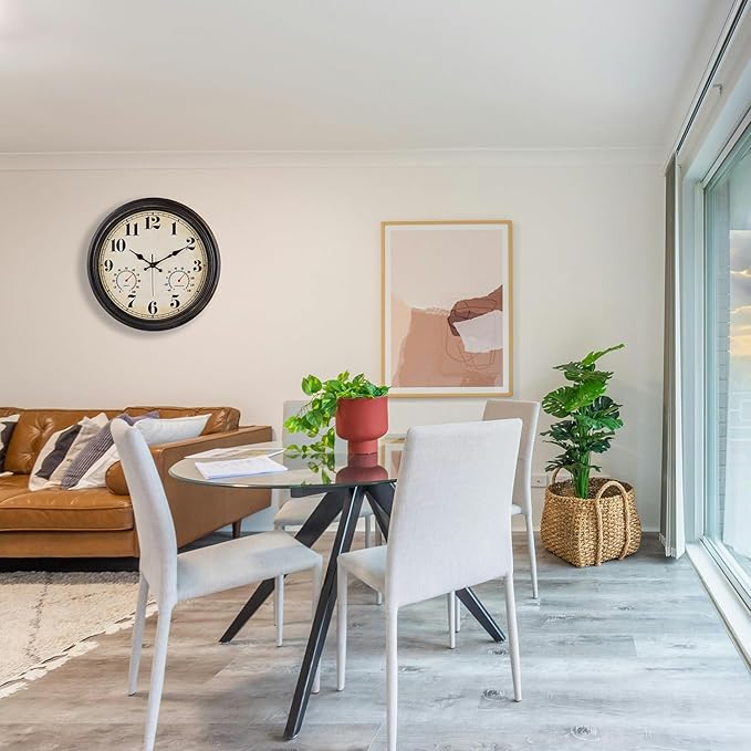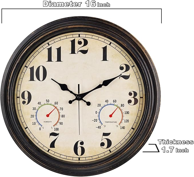 - All-in-One Monitoring: This 16 inch wall clock integrates timekeeping with a built-in thermometer and hygrometer, offering precise time plus up-to-the-minute temperature and humidity data