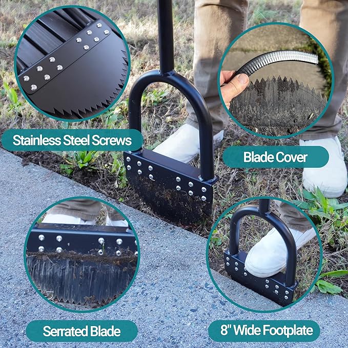 - Serrated Blade for Efficient Cutting: Featuring a high-quality serrated spring steel blade, this edger delivers superior cutting power. Its rust-resistant, water-resistant design ensures easy cleaning and long-lasting durability, making it a reliable, low-maintenance choice for a neat yard