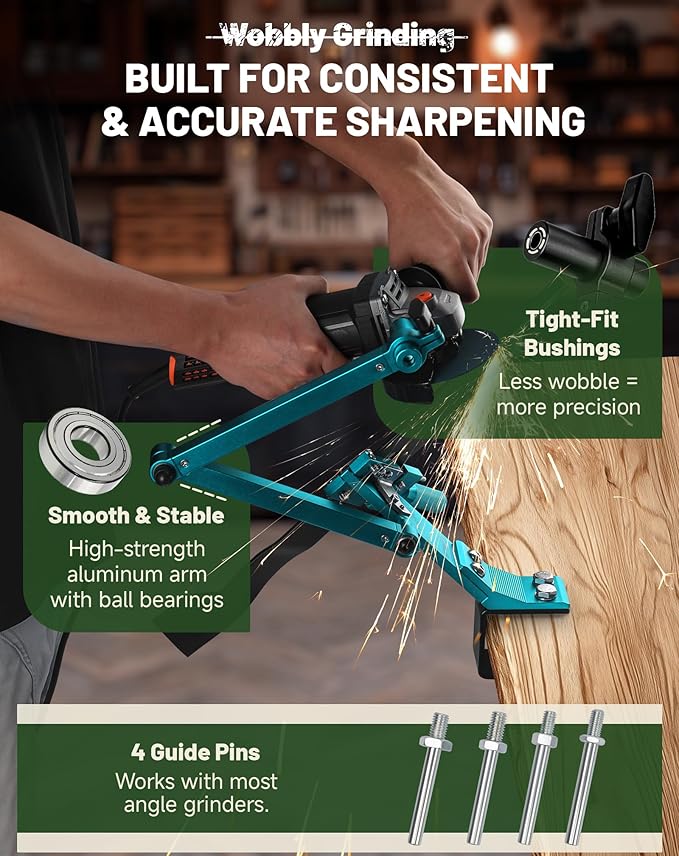 - Sturdy Sharpening Companion: SMOQIO lawnmower blade sharpener features a high-strength aluminum guide arm with built-in ball bearings for smooth, consistent grinding. 4 guide pins to fit most grinders, and precision-fit bushings reduce wobble.