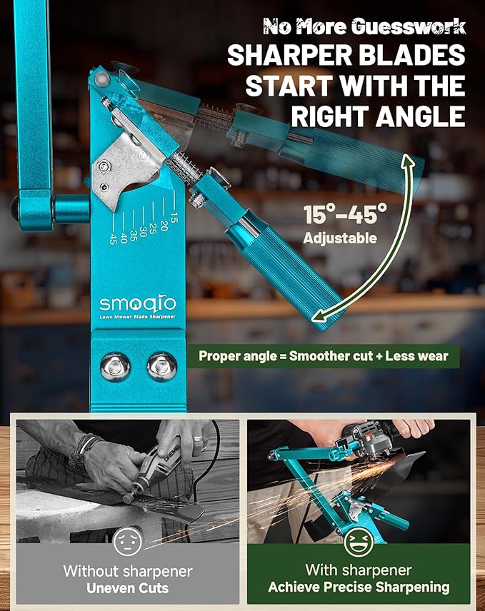 - Precise Sharpening: SMOQIO mower blade sharpener adjusts from 15° to 45°, helping you grind at the right angle. Enjoy sharper blades, smoother mowing, and a healthier lawn.