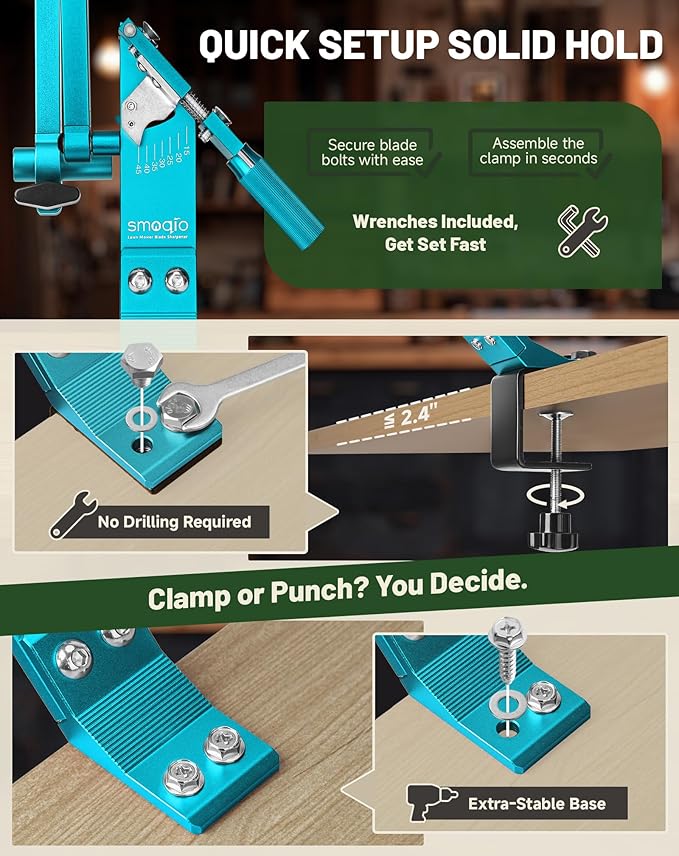 - Dual Mounting Options: SMOQIO lawn mower blade sharpener tool offers two mounting methods—clamp or bolt down. Included wrenches make setup quick and easy, so you can start sharpening right away.