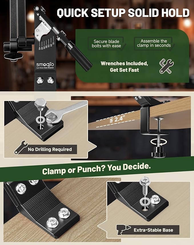 - Dual Mounting Options: SMOQIO lawn mower blade sharpener tool offers two mounting methods—clamp or bolt down. Included wrenches make setup quick and easy, so you can start sharpening right away.