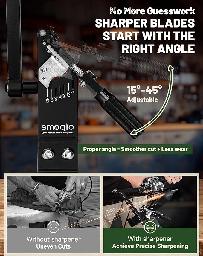 - Precise Sharpening: SMOQIO mower blade sharpener adjusts from 15° to 45°, helping you grind at the right angle. Enjoy sharper blades, smoother mowing, and a healthier lawn.