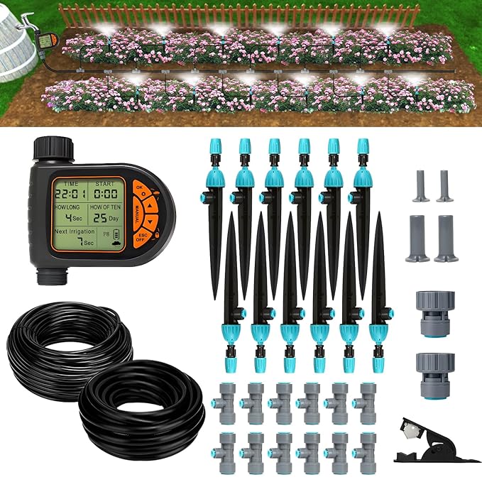 - Complete Drip Irrigation Kit:This drip irrigation kit includes a timer, 79ft 1/4" tube, 40ft 1/2" hose, 12 drippers, connectors, and cutter—an ideal irrigation system for garden or raised beds.