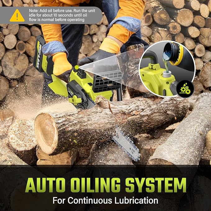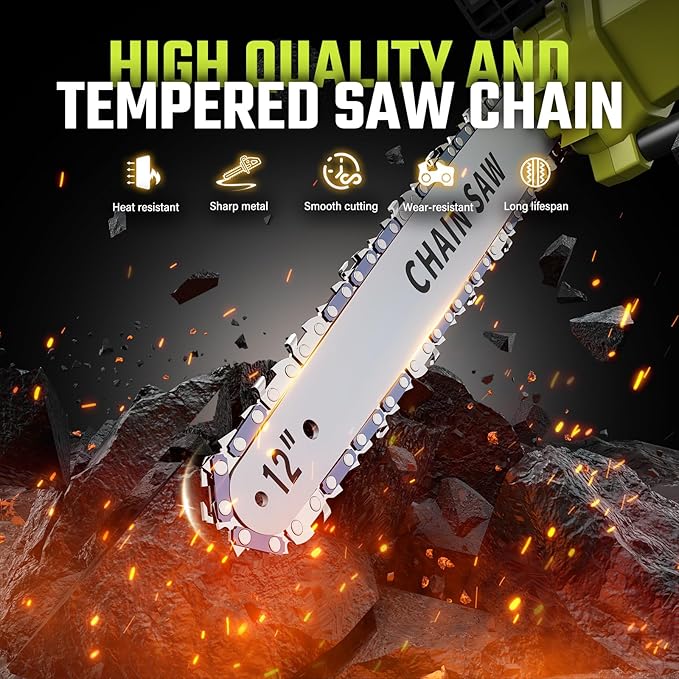 - TRIPLE SAFETY FEATURES: The chainsaw can only be activated by pressing safety button and switch at the same time; And the chainsaw head is designed to reduce kickback; Instant-stop chain brake quickly stops operation within 0.2 seconds when kickback occurs, preventing accidental cuts and minimizing the risk of injury